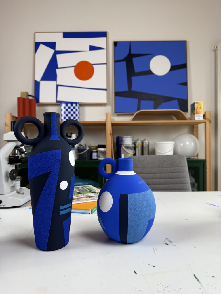 The surface, a composition of midnight-blue planes, electric lines, and cream punctuations, maps a cartography of flux. While its counterpart, Chambre, serves to welcome and stabilize energy, Axe defines its trajectory. The work illustrates a universal law of the living: that no movement can endure without a profound balance between concentration and projection. Through its slender silhouette and rigorous geometry, it eschews mere speed in favor of absolute precision.