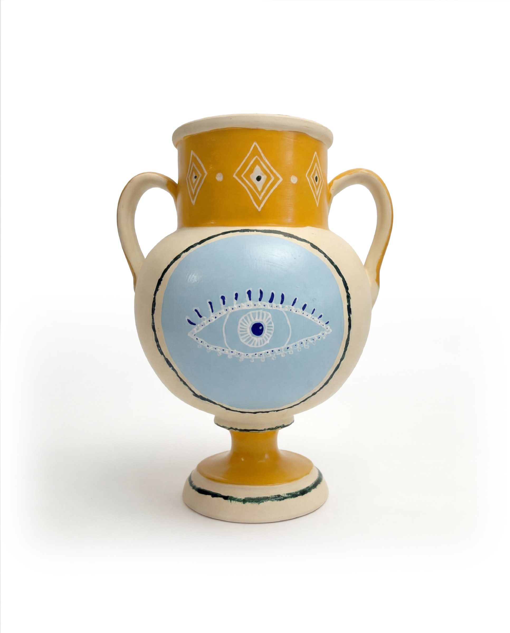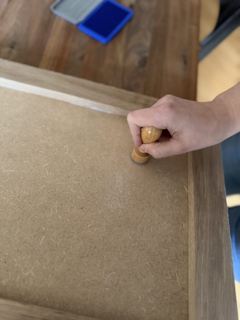 Hand-painted ceramic tile in acrylic, featuring cut and painted canvas applied to the surface. Set within a hand-painted wooden frame.